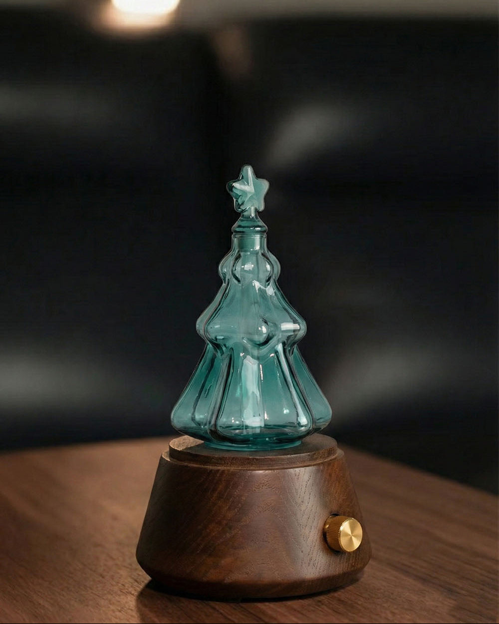 • The Foundation: Solid dark wood diffuser base with metallic dial.