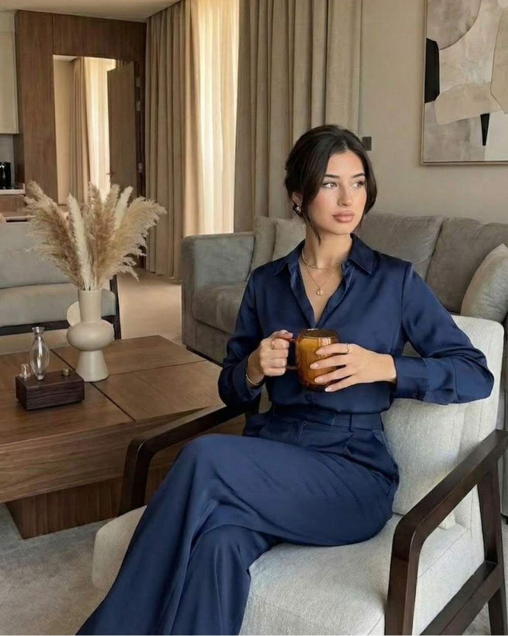 "A sophisticated lifestyle shot in a high-end modern apartment. A woman in a navy blue silk blouse and matching trousers sits elegantly on a light grey armchair, holding a glass of coffee. In the background, the Charabanc waterless scent diffuser with a walnut wood base is placed on a dark wood coffee table next to a minimalist pampas grass arrangement, blending professional style with domestic serenity."